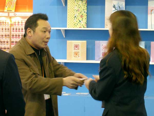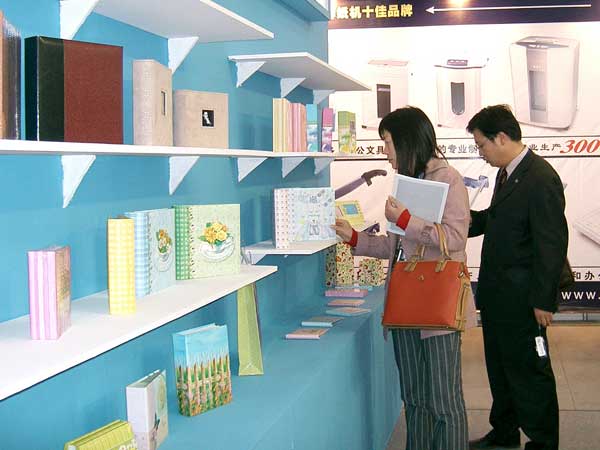 廣博集團(tuán)以藍(lán)色為主色調(diào)的展位設(shè)計(jì),在所有文具展位中脫穎而出,不覺讓人感到眼前一陣亮眼的清爽,展位上擺放的上百個(gè)品種的產(chǎn)品更將眾多的買家吸引到了柜臺(tái)前,4個(gè)展位的展臺(tái)經(jīng)常被客商們擠的水泄不通,這其中金發(fā)碧眼的國(guó)外客商顯得十分搶眼,就連寧波多家媒體記者也被吸引過來,在閃光燈的照射下業(yè)務(wù)員正在為眾多的買家介紹公司的產(chǎn)品。