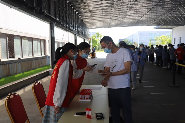在廣博行政大樓、廣博智能倉以及工業(yè)園區(qū)食堂三個核酸采樣服務(wù)工作點,現(xiàn)場參與核酸檢測的員工隊列整齊,志愿者們則引導(dǎo)大家掃碼錄入個人信息,認(rèn)真細(xì)致,一絲不茍,儼然已是抗擊疫情不可或缺的一股力量。