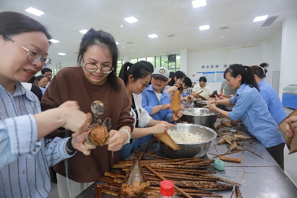 活動(dòng)開(kāi)始后,現(xiàn)場(chǎng)瞬間變得熱鬧非凡。大家紛紛拿起粽葉和餡料,開(kāi)始了自己的創(chuàng)作。有的員工手法熟練,包出的粽子形狀規(guī)整、美觀(guān)大方;有的員工則顯得有些手忙腳亂,但臉上的笑容卻格外燦爛。集團(tuán)公司黨委副書(shū)記舒躍平也加入其中,和員工邊一起交流心得,現(xiàn)場(chǎng)氣氛十分融洽。
