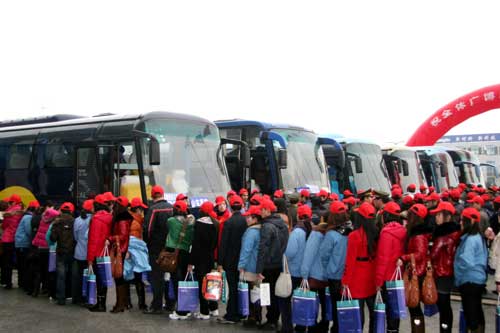 據(jù)了解,浙江廣博集團公司現(xiàn)有員工7000余人,絕大多數(shù)來自江蘇、江西、安徽、河南、山東等省份,過年回家買票難是令他們頭痛的事。為解決職工的這一難題,廣博集團今年包租15輛50多座的豪華大巴轎車,將家住縣城、農村的職工直接送到家門口。對自行探親職工,根據(jù)工齡按比例報銷往返車票。
