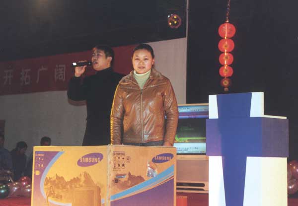 表彰大會過后,令大家期待已久的抽獎活動終于開始了,整個大會的活躍氣氛達到了一個新的高潮,“雞雞向上”獎、“雞祥如意”獎、“雞星高照”獎,別出心裁的獎項設置,已讓抽獎活動增添了一份喜慶。電磁鍋、呢大衣、“廣博牌”538型數(shù)碼相機、電瓶車、29吋大彩電種類繁多的獎品更是讓在座每一位員工按捺不住興奮,每抽取一份獎品在人群中都會發(fā)出陣陣嘖嘖聲,抽到獎品的員工笑逐顏開,捧著獎品帶著好運高高興興回家過大年。