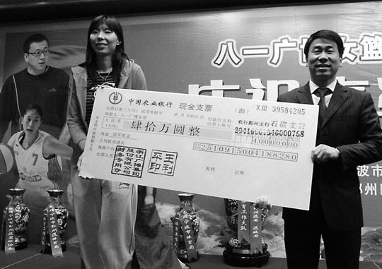 昨晚,鄞州區(qū)政府為奪得總冠軍的八一廣博文具女籃舉行了慶祝嘉獎(jiǎng)晚宴,在慶功宴上,八一女籃獲得100萬(wàn)元人民幣的獎(jiǎng)金,其中廣博公司獎(jiǎng)勵(lì)40萬(wàn)元,鄞州區(qū)政府獎(jiǎng)勵(lì)50萬(wàn)元,寧波市政府獎(jiǎng)勵(lì)10萬(wàn)元。