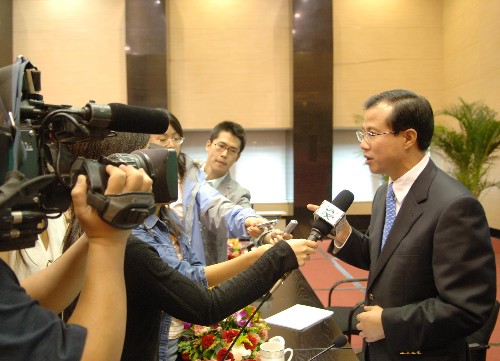 10月9日,商務(wù)部部長助理傅自應(yīng)(右)在接受記者采訪。當(dāng)日,商務(wù)部部長助理、廣交會副主任傅自應(yīng)在新聞發(fā)布會上宣布,第100屆中國出口商品交易會將于2006年10月15日至30日在廣州舉行。新華社記者 陳樹根 攝